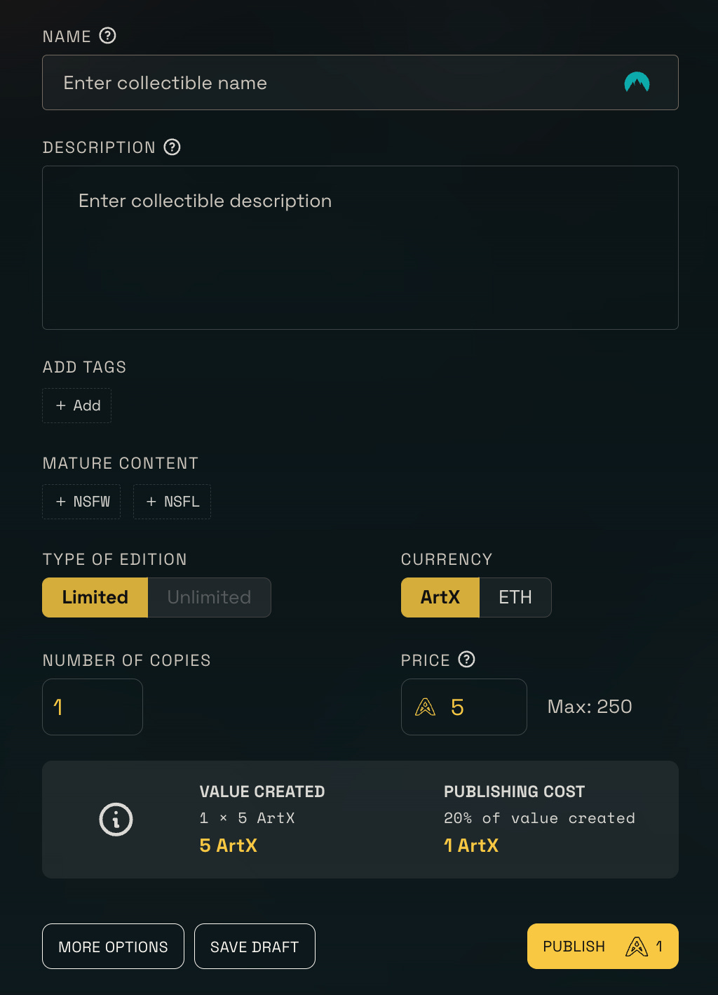 When you publish a collectible, you'll go through the 'publish collectible' workflow where you can now add tags relevant to your artwork. This step is integrated smoothly into the publishing process.
